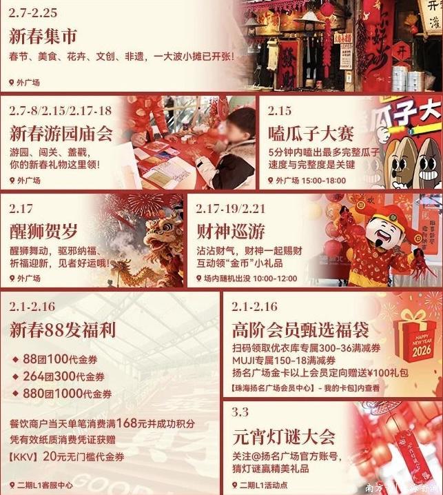 1.海韵城:2月13日至3月14日期间,新春集市热闹开放,您可以参与现场互动活动,也能选购具有珠海特色的伴手礼,将这份海滨之城的祝福传递给亲朋好友。