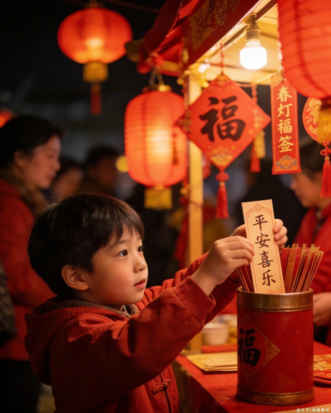 参与者从悬挂的福签或灯笼中随机抽取一枚签文,内容多为吉祥祝福、新年寄语或趣味小诗,寓意收获新年的第一份好运与期盼。