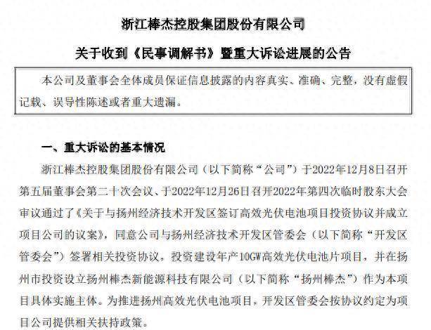 就光伏项目1.4亿补贴款纠纷达成调解棒杰股份披露的公告显示,近日,公司及扬州棒杰收到扬州经开区法院送达的(2026)苏1091民初59号《民事调解书》,主要内容如下:(一)各方协商一致确认:就2022年12月9日相关投资协议项下涉及的开发区管委会已经给付的1.4亿元到期补贴款债务,扬州棒杰确认1.4亿元到期补贴款并由开发区管委会按照破产程序依法申报债权进行破产分配,公司作为连带责任方,应于2026年9月30日前返还;(二)本案受理费减半收取为387608元,由扬州棒杰、公司共同负担,此款开发区管委会已先行垫付,由开发区管委会按照破产程序依法向扬州棒杰申报债权进行破产分配,公司于2026年9月30日前向开发区管委会支付;(三)本调解协议生效后,开发区管委会与公司(不包括扬州棒杰)之间基于2022年12月9日相关投资协议产生的权利义务及合同纠纷事宜处理终结。