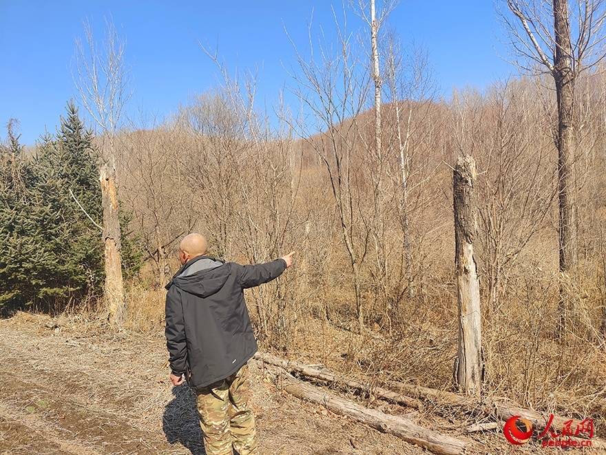 村民姜志军指向已经死亡断裂的杨树。人民日报记者 赵兵摄
