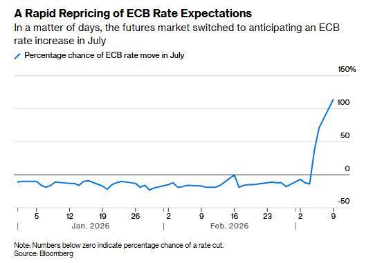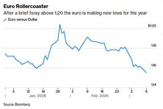 短短数周前,欧元兑美元还曾触及1.20关口——这一水平向来会引发欧洲央行的警惕;但本周,欧元兑美元汇率已骤然跳水至1.15附近,这种剧烈的短线急跌,极易触发央行层面的不安。由于欧洲经济体对能源价格上涨的风险敞口极高,随着油价徘徊在每桶100美元附近,欧洲正面临能源价格攀升的致命威胁:2022年俄乌冲突爆发后,能源成本飙升推升消费物价的惨痛记忆,对市场而言仍历历在目。