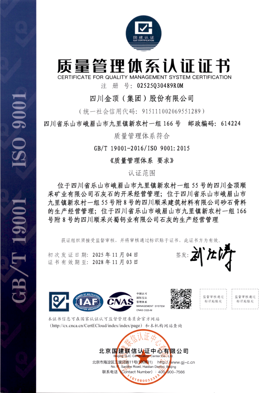 近日,集团公司顺利完成综合管理体系认证提级审核工作,将原由四川金顶(600678)顺采矿业有限公司承担的认证体系全面提级至集团层面统筹管理。此次认证覆盖四川金顶顺采矿业有限公司、四川顺采建筑材料有限公司、四川顺采兴蜀钙业有限公司三个子公司,标志着集团在管理体系标准化、规范化建设方面迈上新台阶。