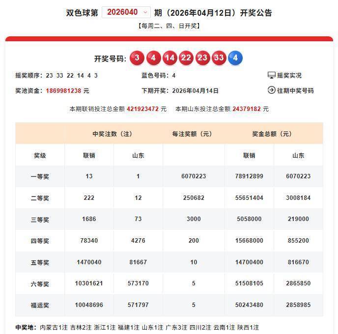 4月12日,双色球第2026040期开奖,红球号码:3、4、14、22、23、33,蓝球号码:4。当期中出一等奖13注,单注奖金607.02万元,广东3注,吉林、四川各2注,内蒙古、浙江、福建、山东、云南、陕西各1注。