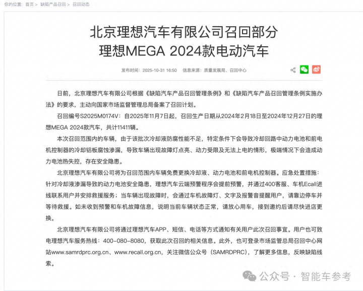 这个召回,也是理想对10月23日MEGA车辆起火事故的调查结果及回应。