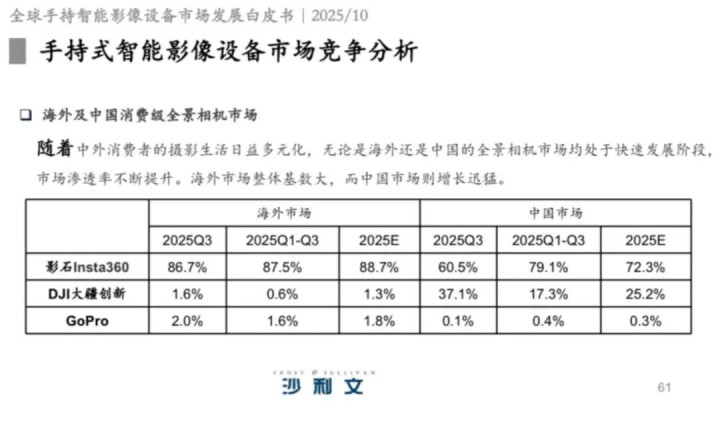10 月31日,全球权威机构沙利文最新白皮书显示,2025 年全球及中国手持智能影像设备市场格局迎来调整。影石 Insta360 在全景相机领域持续领跑,全球市占率连续8年位居第一,2025年前三季度全球占比超85%。单看 Q3 单季,影石全球市占达 75%,国内市占 超60%,头部地位稳固;大疆于今年 7 月首次切入全景相机赛道,凭借价格战快速突围配资查询之家门户,在Q3拿下约 17.1% 的全球份额,借助大幅降价等方式更是获得37.1% 的国内市场。